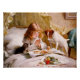 Vintage illustration of a lovely young girl praying before having breakfast in bed while a cute little kitten and a small dog are watching, eager to catch a piece of food. Oil on canvas by Charles Burton Barber.