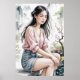 Esta arte mural retrata uma jovem serena sentada graciosamente numa cena de jardim tranquilo. Vestida em uma blusa cor-de-rosa macia e saia de denim, ela expele um ar de contemplação silenciosa. Seu longo e fluido cabelo preto pega uma brisa suave, enquanto florescem ao seu lado flores delicadas, acrescentando pedaços de rosa macio ao cenário pacífico. O fundo nebuloso, semelhante à aquarela das montanhas e da folhagem melhora a atmosfera do sonho, fazer esta peça uma mistura perfeita de elegância, natureza, e reflexão calma.