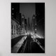 Uma cena urbana modesta da cidade de Windy. Tirada do famoso trem L de Chicago (ou The El), esta imagem em preto e branco olha ao longo das linhas do trem através dos arranha-céus altos para Willis Tower (antes conhecida como Torre Sears).