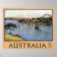 Poster de viagens vintage para a Austrália, mostrando uma ilustração do porto de Sydney.