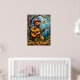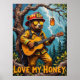 Essa trabalho de arte encantadora apresenta um urso vestido de bombeiro, cheio de capacete e óculos de sol, tocando um violão acústico enquanto se assentava confortavelmente em um galho dentro de uma floresta serena. Um pote de mel fica perto, prometendo uma recompensa doce. O fundo mostra pinos altos e folhagem esmagadora sob uma luz macia, convidando. As pinceladas grossas e texturizadas da pintura dão uma sensação caprichosa e entusiasmante, com "Love My Honey" escrito abaixo.