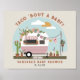 Taco temeu chá de fraldas de menina com ilustração do caminhão taco taco, com camionete retrô, cor-de-rosa e branco, com roupas de bebê penduradas na linha de roupas ligadas à árvore de pássaros sob um céu azul com sol e nuvens. texto diz "Taco Bout A Baby!" Camper é decorado com terra de balão, pampas, cacto, papel picado e plantas em potes de terra cotta.
