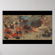 The encounter between two great generals, Takeda Shingen and Uesugi Kenshin in the battle of Kawanakajima that in the 16th century opposed the two provinces Kai and Echigo. Kenshin galloped into the enemy camp, brandishing his sword with both hands above his head while his horse stands. Taken by surprise Shingen raises his war fan to ward off the blow. Around them the battle rages in the night.Utagawa Kuniyoshi