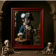 Esta imagem impressionante mostra um Bulldog Francês bronzeado e castanho escuro, magnífico vestido de capitão pirata. Ele estiva um chapéu tricórnio e um elaborado casaco azul com um trim de ouro brilhante. Abaixo do casaco, um colete vermelho com sotaques de ouro é visível, completando seu traje distinto. O canino real está confiante, uma pata descansando sobre um tesouro cheio de ouro, incorporando um comportamento sério e aventureiro.