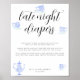 Um elegante chá de fraldas de chá para bebês, "fraldas noturnas tardias", com uma placa de chá doce da China, em azul periwinkle e em camadas com rendas brancas (este é um efeito digital), com elegante caligrafia em tom de ouro (este é também um efeito digital).