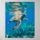 Fotografia subaquática de uma tartaruga marinha nadando em água cristalina logo abaixo da superfície.