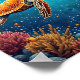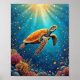 Tartaruga do Mar Submarina - Uma vibrante cena submarina mostra uma grande tartaruga marinha nadando graciosamente através de uma tartaruga e oceano azul. A carapaça da tartaruga é uma bela laranja e marrom, com padrões intrincados. A luz do sol segue de cima, criando um efeito brilhante na água. Pequena natação amarela de peixe à volta da tartaruga, aumentando para a atmosfera viva