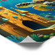 Esta poster apresenta uma tartaruga marinha feliz nadando até um castelo submarino como natação de peixe ao fundo. Terminado em um impressão de tinta a óleo.