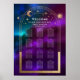 Planta Cósmica Roxo Teal Dourada Sol Lua Estrelas Astronomia Sentagem de Casamento Gráfico Poster de Sinal de Casamento Impressões apresenta sol dourado, lua e estrelas com um ouro sobre roxo místico colorido, cor púrpura, lacre e fundo cósmico azul. Dentro, o quadro é o texto "Bem-vindo" em um roteiro elegante de caligrafia branca e suas informações personalizadas de assentos de casamento. Projetado para você por ©Evco Studio www.zazzle.com/store/evcostudio