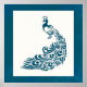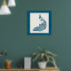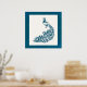 Um poster com a imagem de um pavão teal com penas ricos. Colocado sobre um fundo de aquarela lacrimogêneo com um quadrado colorido creme em camadas sobre o topo. Um estilo ousado de deco de arte. Moderno e clássico