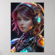Um caráter futurista com cabelos roxos vibrantes e aperfeiçoamentos cibernéticos intrincados avança, mostrando uma mistura de características humanas e elementos mecânicos. O uso de luzes brilhantes e componentes metálicos destaca a avançada tecnologia do personagem.