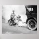 Policial de motocicleta que percorre um carro com um dispositivo de tela de fumaça instalado. Foto tirada em 1º de setembro de 1923.
