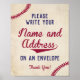 Mostre nosso sinal de chá de fraldas temático de baseball antigo para pedir aos convidados para se dirigirem a eles próprios. Forneça envelopes de vazio e algumas canetas e deixe nosso sinal solicitar aos convidados que escrevam seu nome e endereço no envelope. Isso ajudará a mamãe a poupar tempo e o incômodo de encontrar endereços quando for hora dela escrever notas de agradecimento!
