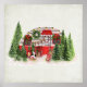 Um poster com um tema de Natal bonito e caprichoso. Um trailer aconchegante decorado para o sorteio de Natal entre alguns pinheiros.