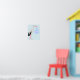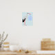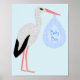Este poster apresenta uma imagem gráfica de uma bela Stork branca com penas de cauda pretas segurando-as num pacote azul pálido de cobertores. Há um texto azul no pacote que diz "Menino". Esta design é perfeita para celebrar um menino.