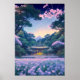 Um espetacular templo de madeira está sobre a borda de uma floresta verde esmagadora, com um campo de flores roxas vibrantes em frente a ela. O templo expele um senso de tranquilidade e paz, misturando-se perfeitamente ao seu meio natural. As árvores se movem suavemente na brisa, e o som distante de um riacho pode ser ouvido.