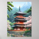 Uma cena tranquila se desdobra como um templo tradicional japonês se destrói sobre uma margem rochosa ao lado de um rio que flui suavemente. O cenário sereno é rodeado por um verde-luxuoso, com árvores floridas de cerejeira em floração de cheio e uma floresta verde ao fundo.