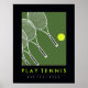 Uma boa ideia de decor de parede para um jogador de tênis, com um design gráfico de raquetes e uma bola amarela com as palavras: jogar tênis, e sentir-se bem...