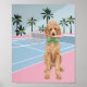 Este impressão de arte apresenta um retrato de aquarela de um poodle bronzeado segurando uma raquete de tênis em um campo de tênis rosa.