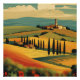 A imagem mostra uma paisagem estilizada inspirada pelas colinas rolantes da Toscana. O primeiro plano apresenta vibrantes papoilas vermelhas e vários tons de folhagem verde. Colinas gentis, feitas em uma manta de amarelos quentes, laranjas profundas, e verduras sujas, sugerem campos e prados agrícolas. Uma fileira de ciprestes alto e fino, que são características da paisagem da Tuscana, conduz o olho em direção a um prédio tradicional de pedra com uma torre proeminente, possivelmente uma fazenda ou uma vila, sentada sobre uma colina. O fundo mostra mais colinas recuando na distância sob um céu macio, onde um sol grande, pálido ou lua pendura logo acima do horizonte, lançando uma luz tranquila sobre a cena. A trabalho de arte tem uma qualidade pacífica, quase sonhadora, com cores ousadas e formas simplificadas, quase geométricas, que lhe dão uma sensação ligeiramente abstrato ou ilustrativa.