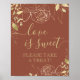 Este poster apresenta pedras e folhagem douradas num estilo de desenho de linha moderno e mínimo sobre fundo sólido. "O amor é doce, por favor, faça um tratado!" está no ouro correspondente, apresentando uma tipografia cursiva manuscrita. Esta placa é a forma perfeita de deixar os convidados do casamento ou do chá saberem onde pegar suas doces roupas.