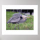 Na fotografia original deste impressão, o Excelente Blue Heron, ao longo da margem de um canal, vê algo mais longe na via navegável, uma possível ameaça ao seu território. Ele punha as penas das cinzas azuladas nas costas para se fazer parecer maior. Com suas longas e finas pernas espalhadas à medida que olha hetero à frente, o pássaro está pronto para defender seu espaço na grama verde. Reflexões escuras e onduladas sobre a água do fundo da cena. Há uma grande borda branca ao redor da fotografia, com título e crédito do fotógrafo em texto pequeno sob a foto.