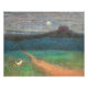 Step into a world of quiet magic with this captivating poster print featuring a Japanese Nihonga masterpiece. This artwork poetically evokes the sound and feel of a deep, tranquil forest, capturing a serene and mysterious scene: a lone white cat begins a midnight journey towards a distant, ancient German castle, set against the backdrop of a vast, enchanted forest.