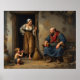 A family scene unfolds outside a rustic home, where a woman with a broom looks at a seated man holding a mug, and a small child sits on the ground nearby. The setting reflects a pastoral lifestyle, with simple clothing and household items like a basket and clay pot contributing to the rural ambiance.