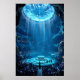 From this celestial ceiling, ribbons of starlight fall like luminous rain, creating a natural spotlight effect that bathes the circular stage below in an otherworldly blue glow. The central platform, ringed by concentric circles that seem to pulse with their own inner light, serves as the nexus point where performers channel the venue's mystical energy.