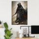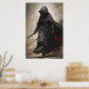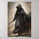 A hooded, dark-robed individual holds a sword in a poised stance, exuding a sense of mystery and intensity. The background features abstract, earthy tones that enhance the dramatic atmosphere.