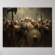 An imposing group of armored warriors with long beards and determined expressions advances with weapons in hand. Their rugged attire, featuring shields and axes, gives a sense of readiness for battle.