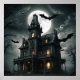 A spooky, gothic mansion stands under a full moon, surrounded by swirling clouds and flying bats. The eerie glow from the windows suggests a haunting presence inside.