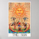 Ra in his solar barque seemed like the only real option for the Sun card. I found and used appropriate passages from the Egyptian Book of the Dead for the upper 2 corners. All of the zodiac signs are placed within the rays of the sun. I replicated the look of papyrus for the background. The eyes of Ra and Horus are also the eyes of a face in which the sun is the third eye and the barque is the big smiling mouth. The disk on Ra's head could be construed as a clown nose.