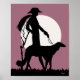 Uma silhueta de moda deco de na moda de mulher e cão contra uma lua branca brilhante, fundo rosa poeirento com silhueta preta.