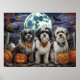 Libere o espírito assustador com esta design sombria do Dia das Bruxas apresentando um bando de cachorros sob um céu escuro e iluminado, cercado por morcegos voadores e abóboras brilhantes. Perfeito para aqueles que amam um toque de diversão terrível com seus amigos peludos!