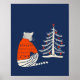 Ótima ilustração de um tigre vestido com um suéter vermelho esperando o Natal em frente à árvore.