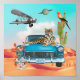 Arte de Muro de Colagem Moderna. Esta é ícones retrorreflectores antigos com avião vintage e carro azul, com tigre, cacto, deserto, planeta, papagaio e flores. Cores de laranjas, azuis e pêssego. Divertido, mod e efemémia eclética. Esta é uma superfície plana com um acabamento de canvas liso. Arte divertida e surreal usando uma mistura de técnicas de colagem e arte digital, com uma sensação retrorreflectora vintage, do século médio.