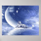 Tigre branco coloca-se em lua crescente sobre a água refletora com poeira estelar e fadas ou fadas em torno da fantasia poster de tamanho 20x16