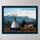 Uma imagem de um nativo americano e seu cavalo perto de uma tigela. A neve assentou nas encostas dos mais alto das montanhas ao fundo. Adicione seu próprio texto.
