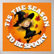 Esta é a estação para ser assustadora e uma bruxa fofa em um chapéu preto está dançando nas folhas do outono.