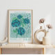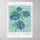 A serene and cool-toned design blending Japanese-inspired botanicals with a minimalist exhibition aesthetic. This illustration features lush, layered hydrangeas in a sophisticated palette of navy, teal, and soft sage green, set against a calming mint background with delicate floating blossoms.