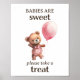 Torne o seu chá de fraldas de menina ainda mais especial com este adorável poster "Bebês são doces, tratem"! Apresentando uma doce ilustração aquosa de um ursinho de pelúcia bonitinho com um balão cor-de-rosa, este cartaz encantador é a adição perfeita à sua sobremesa ou favorece a mesa. Ordene o seu hoje para adicionar um toque final encantador à sua comemoração!