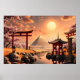 Um trabalho de arte de fantasia cativante que representa uma cena solar serena, com portões vibrantes de torii vermelho graciosamente em pé no meio de florescentes árvores cerejeiras floridas. Um rio tranquilo reflete as matizes ouros do pôr do sol, enquanto as tradicionais lanternas japonesas e um pequeno templo acrescentam encanto cultural. Ao fundo, uma pirâmide majestosa sobe contra um pano de fundo de montanhas distantes, misturando o antigo misticismo com a beleza da natureza. Ideal para amantes da fusão cultural e paisagens tranquilas, esta peça traz paz e maravilha a qualquer espaço.
