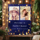 Uma poster de boas-vindas para duas pessoas, amigos, irmãs, gêmeos. Um fundo azul marinho, incolor, decorado com estrelas douradas falsas. Personalizar e adicionar 2 fotos, nomes e datas