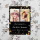 Um sinal de boas-vindas fotográfico para duas pessoas, amigos, irmãs, gêmeos. Um fundo preto, decorado com estrelas douradas falsas. Personalizar e adicionar 2 fotos, nomes e datas