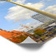 "Television Tower, Berlin, Alemanha, aspecto de 16 por 20 polegadas", por Catherine Sherman. Uma torre de televisão alta sobe de forma proeminente em Berlim, na Alemanha, contra um pano de fundo de um céu parcialmente nublado, criando uma linha do horizonte impressionante. Abaixo, um espaço público movimentado é pontilhado com pessoas e flanqueado por árvores de cor do outono. A torre de televisão Fernsehturm, no centro de Berlim, na Alemanha, foi construída entre 1965 e 1969 pelo governo da República Democrática Alemã, ou Alemanha Oriental, como um instrumento de radiodifusão funcional e um símbolo do poder comunista. Continua a ser um marco da sua posição próxima a Alexanderplatz no bairro de Marien Quarter, na cidade de Mitte, visível na maioria dos distritos suburbanos de Berlim. É a estrutura mais alta da Alemanha a 1.207 pés (368 metros) incluindo antena e a terceira mais alta estrutura