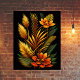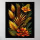 Esta ilustração apresenta flores e verduras tropicais laranja, capturadas com uma nitidez espantosa com designs intrincados e detalhados. As flores são lindamente desenhadas com pétalas delicadas e padrões intrincados, enquanto as sementes são retratadas com folhas e caules finamente detalhados. O fundo preto fornece um belo contraste, permitindo que as cores vibrantes das flores e das sementes se destacem ainda mais. Criada com tecnologia de ponta, é uma representação bela e artística da natureza.