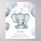 Convide seus hóspedes para fazer um brinde com este adorável poster chá de fraldas com elefante de bebê azul e cinza com balões e confete. Facilmente personalizado para seu evento clicando em "personalizar".