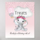 Mostre aos seus hóspedes onde estão as guloseimas na sua festa de chá de fraldas com esta adorável menina elefante com rosa rosa rosa, faixa floral, elefante fofo num balão de ar quente cor-de-rosa com nuvem branca e fundo de gradiente rosa.