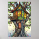 Impressão de arte de parede branca apresenta uma ilustração de uma casa de árvore com paredes de vidro manchadas. Gráfico projetado com software de assistência IA.